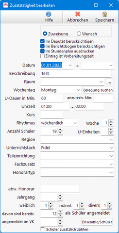 Möchten Sie über die Zusatztätigkeiten Projekte, Workshops, etc. erfassen, können Sie jetzt bei der Angabe „U-Einheiten“ auch die konkrete Anzahl der Unterrichtseinheiten erfassen. Hierbei ist der Zeitraum nicht mehr von Bedeutung, d.h. die Anzahl der Unterrichtseinheiten wird nicht mehr über den Stundenplan ermittelt. Dies ist sehr hilfreich bei der Erfassung von Unterricht, der nicht regelmäßig stattfindet.